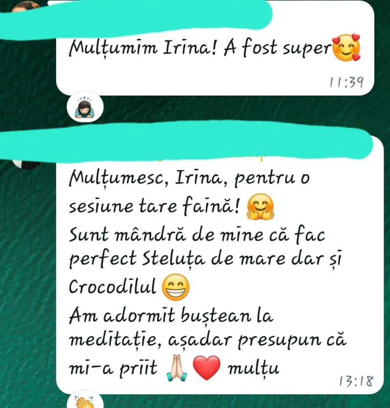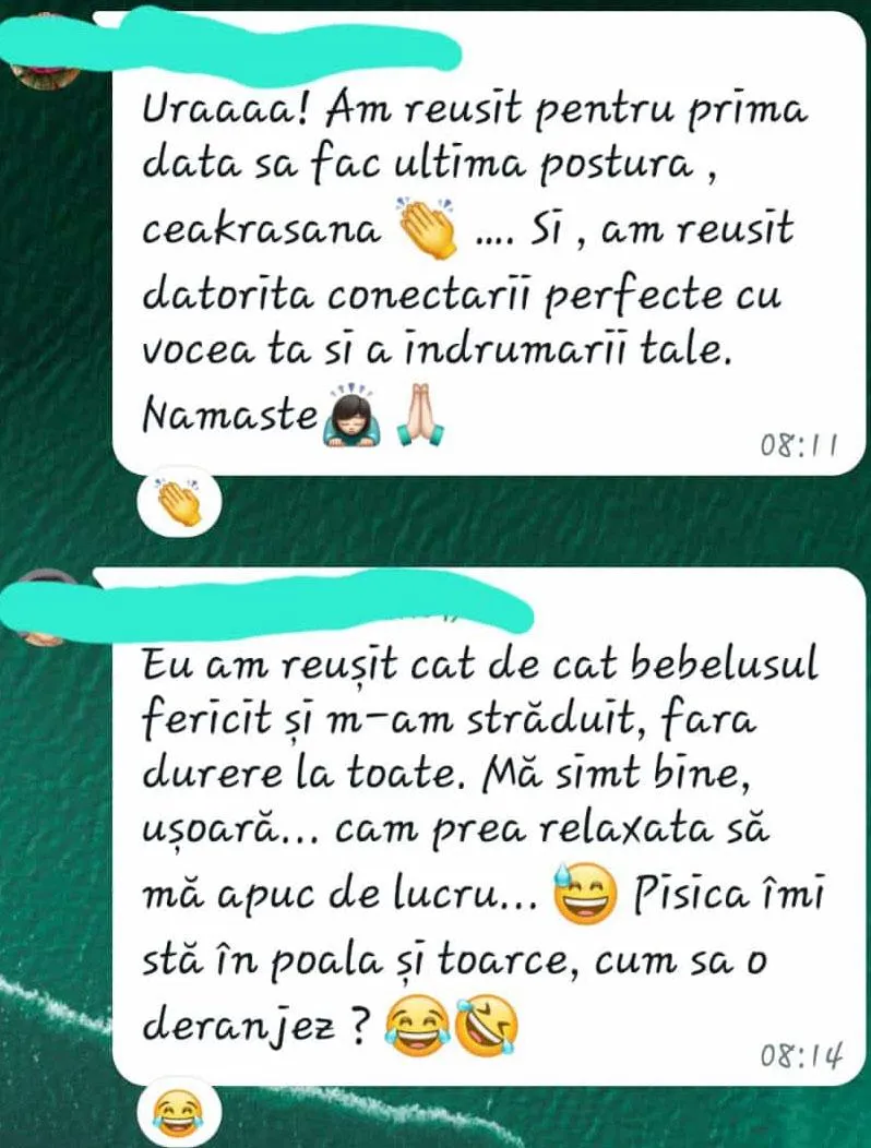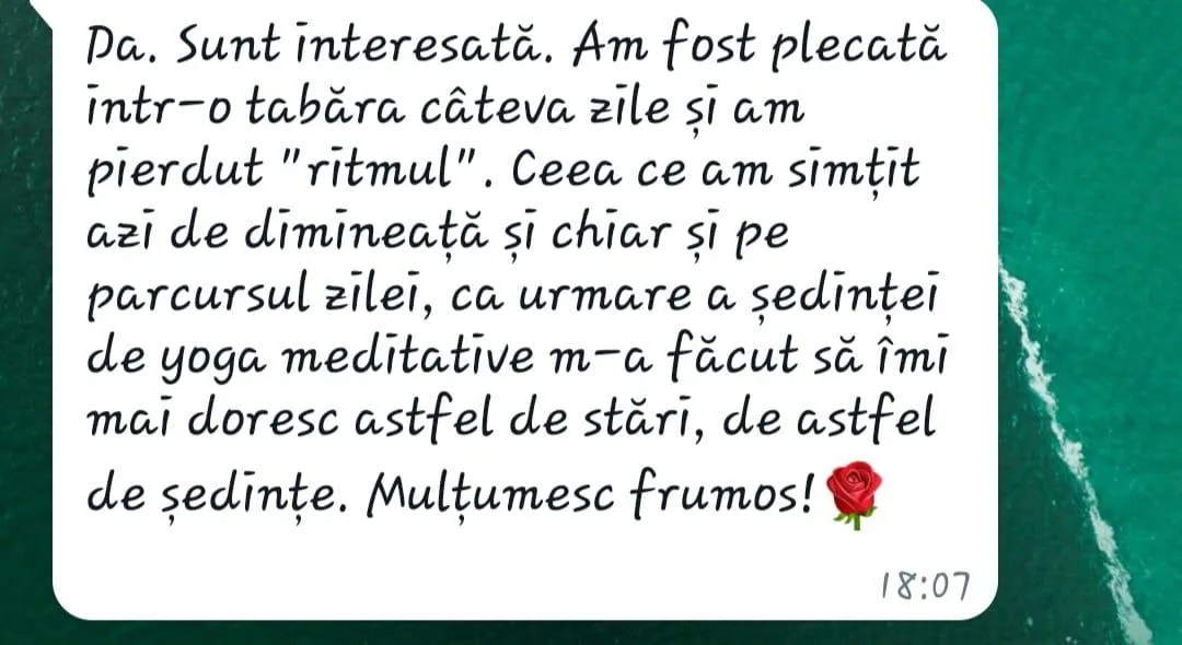 Tocmai pentru că ştiu că îţi este greu să faci aceste pauze pe cont propriu, vreau să te anunţ cu bucurie că am creat o comunitate de Yoga meditativă, unde alături de alte femei ca şi tine, îţi poţi antrena şi echilibra şi tu corpul - mintea - şi muşchii sufletului.